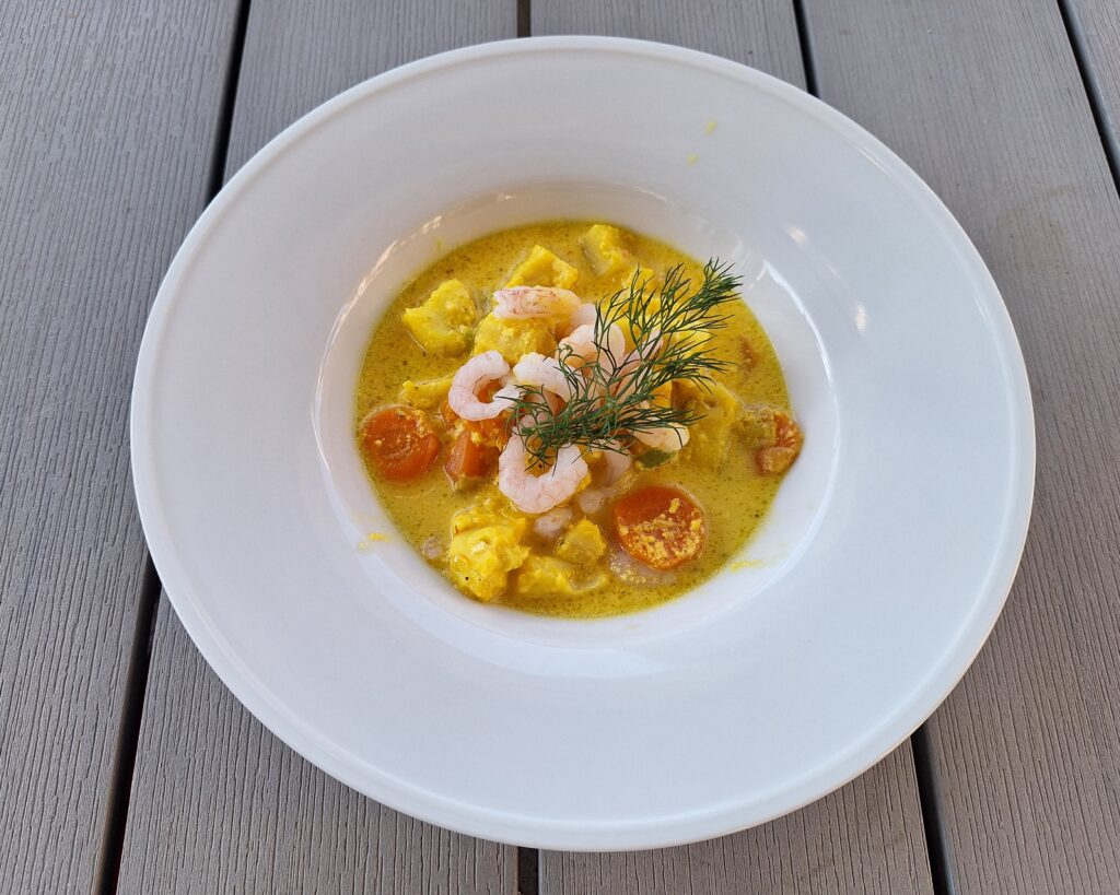Tillsätt grädde, finhackad dill och sambal eller chiliflakes.