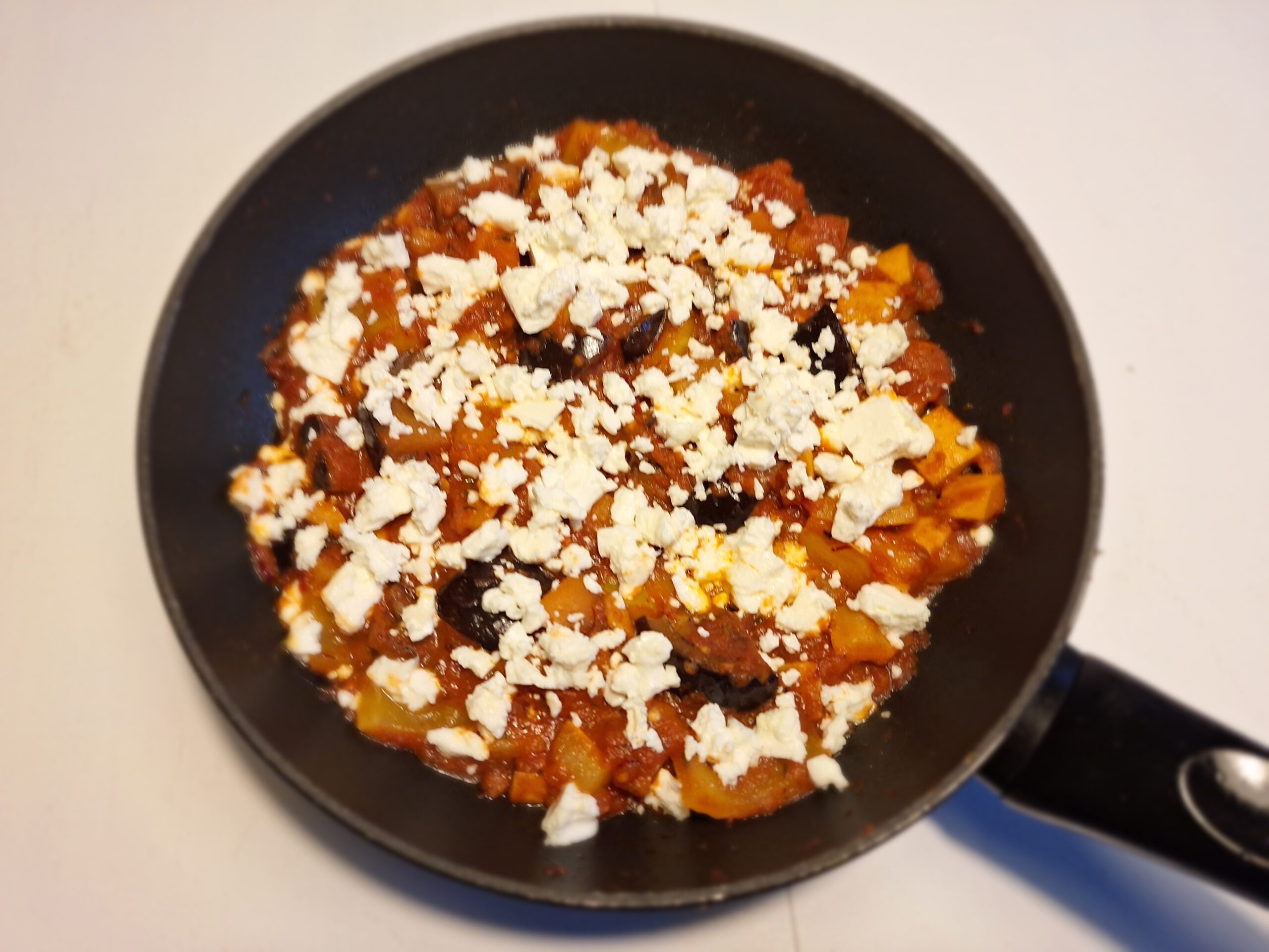 Skär squash, aubergine och paprika i 2 cm:s kuber.